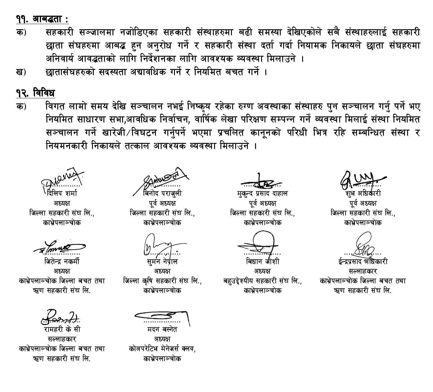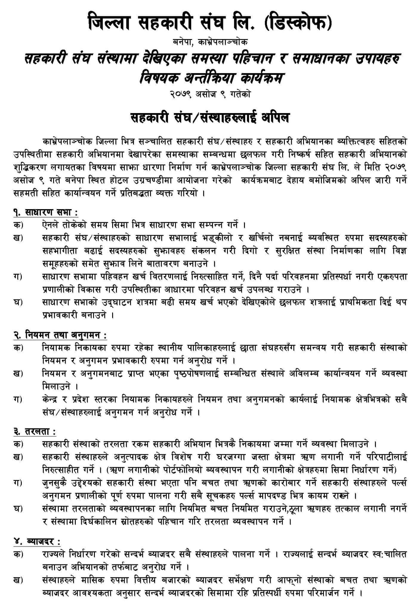 १२ जना भन्दा बढी सहकारी अभियानका व्यक्तिहरुले सुझाव राखेको उक्त कार्यक्रममा जिल्ला सहकारी संघका सञ्चालक तथा लेखा सुपरिवेक्षण समिति, पूर्व अध्यक्ष तथा सल्लाहकार, विषयगत संघका अध्यक्षहरु, राष्ट्रिय सहकारी बैंक काभ्रे शाखा, म्यानेजर्स क्लव, काभ्रे र लामो समयसम्म अभियानमा निरन्तरता दिनुहुने अभियानकर्मीहरुका बीचमा छलफल गरी विभिन्न विषयहरुमा सहकारी संस्था सढढिकरण, सुद्धीकरण, विकास अनि प्रवर्द्धनमा लाग्ने सामुहिक उत्तरदायित्व बहन गर्ने प्रतिबद्धता सहित नजिकिदै गएको बडा दशै, दिपावली, छट लगायतका पर्वहरुको अवसरमा शुभकामना आदन प्रदान सहित अपिल जारी गरिएको छ ।