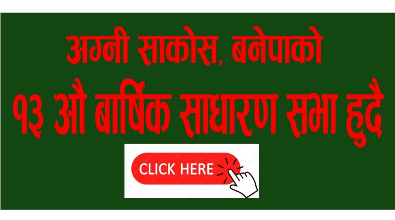 Read Moreबनेपा । काभ्रेपलाञ्चोक जिल्ला बनेपामा रहेको चिरपरिचित सहकारी अग्नी बचत तथा ऋण सहकारी संस्था लिमिटेडको १३ औ बार्षिक साधारण सभा